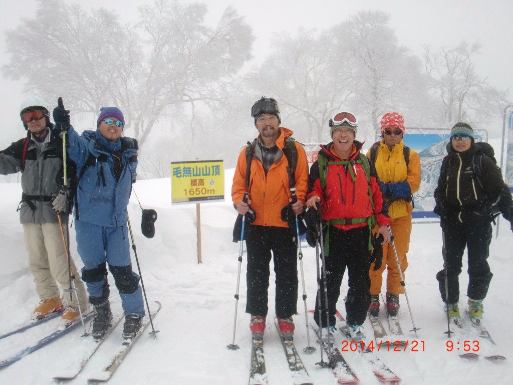 二日目の毛無山山頂です。右から三人目が投稿者(20年ぶりのスキーでした)