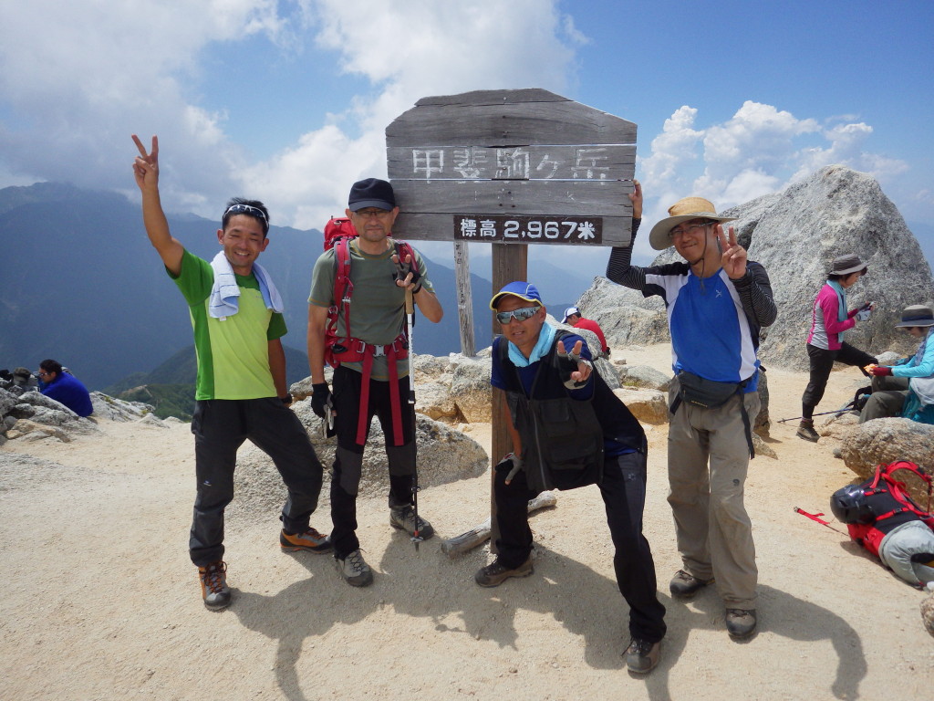 チームI垣は、鋸岳と甲斐駒を目指し、合宿をスタート。出発時は、他のパーティーとも合流でき、お互いの登頂を健闘し合いました。戸台川の渡渉、ガレ場登り、ルートの判別の悪さは、まさにバリエーションルートといった感じでした。鹿の穴からルートを間違い、大ギャップの下降で時間切れ。思わぬビバーク・・・。つらいひと夜を過ごすことになりました。ビバーク地点から稜線に出た時は、本当にうれしかったです。まさか甲斐駒まで行けるとは思わず、みなさんのおかげで、本当に経験値のアップした夏合宿となりました。お疲れ様でした。