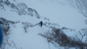 ロープウェーを使って快適に登ってきました。思ったよりも雪があり、心配していたより、よい状態でした。快晴ではなかったですが、久しぶりに冬の千畳敷へ来て、新婚旅行に行ったスイスを思い出しました。冬期の時間設定で、バスは8時5分発。千畳敷の駅に着いたのは、9時過ぎ。遅いスタートでしたが、すでに標高は2620m。サキダル尾根は駅の本当に真ん前の尾根で、全貌がしっかりと見えました。途中からザイルを出し、カムやブッシュで支点をとりながら、1ピッチで頭に出ました。稜線に出ると風が強く、久しぶりに寒風を浴びました。11時半すぎに宝剣の山頂を踏むことができました。平日にも関わらず人が多く入っており、やはりロープウェーの力はすごいと感じました。土日だったらと思うとぞっとします。12時55分のロープウェーに乗ったので、実働は3時間ぐらいでしたが、冬のバリエーションをやりたい人や冬の岩稜、稜線歩きにチャレンジしたい人にはお勧めです。