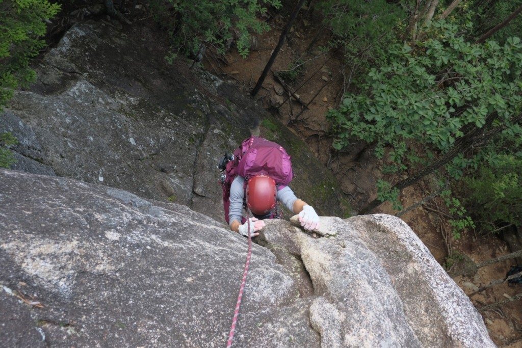 本来はトラバース直前の立木までが第4ピッチですが、ここからはほとんど声が届かなくなるため、ワイドパートを登りきった立木でピッチを切りました。