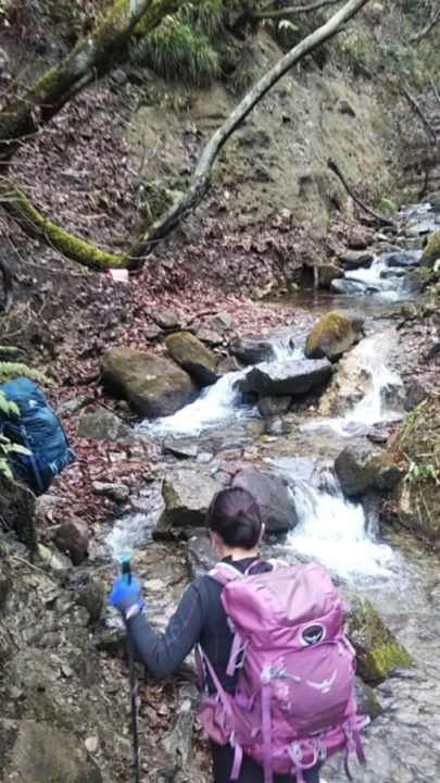 登山口から小さな渡渉が3回程有り。前日の雨で少し増水している雰囲気。 登りになるとまあまあの急坂。前日の雨で落ち葉と粘土質ぬかるみのコンビでずるずる。このルートはほぼ直登なので登り一本調子。