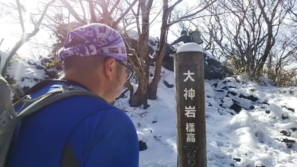 大神岩手前からだんだん雪道になるも積雪5cm位。アイゼンは不要。