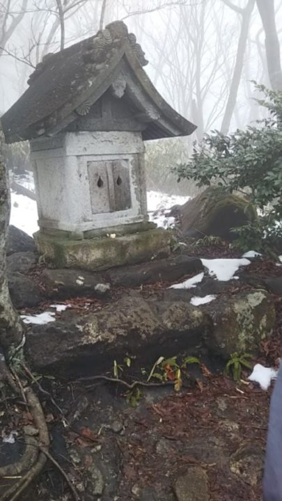 5合目に日留神社の小さな祠があった。この辺りから足元に雪がちらほら。そしてこの辺りから小雨が降り出す。どうやらこの高さの雨雲のようだ。