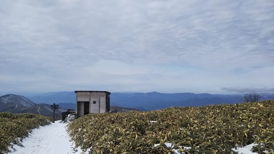 ひたすらなだらかな道を登りひらけた所に出ると天気が良く大山が見えた。使用可能なトイレ有。 頂上手前に避難小屋があるのでそこで昼食を摂取。