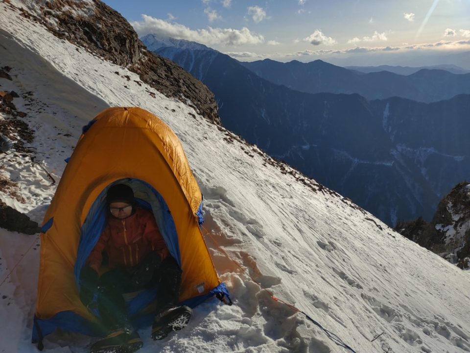 戸台駐車場で田代さんと合流し、戸台川沿いに歩く。渡渉は2回で、ストックがあると安全にクリアできる。2時間ほど歩くと角兵衛沢出会、そこから角兵衛沢を詰める。前半は雪はほとんどなし。ところどころある赤テープを探しながら歩く。中盤くらいから雪が増えてきて、雪とガレの混ざった登りとなり、想像するにた易いと思うがストレスと疲れが蓄積される。後半になってくるとガレはなくなるが、モナカ雪となる。疲れとストレスの蓄積度は変わらない。しばらくすると岩小屋下のテント場に到着する。とてもよいところと聞いていたが、もはやテントサイトと言っていいくらいの好立地… でもまだ時間あるからと、角兵衛沢のコルの手前のテント場を目指したところ、ここからの登りはキツかった。そして、テント場もキツかった(狭かった)。