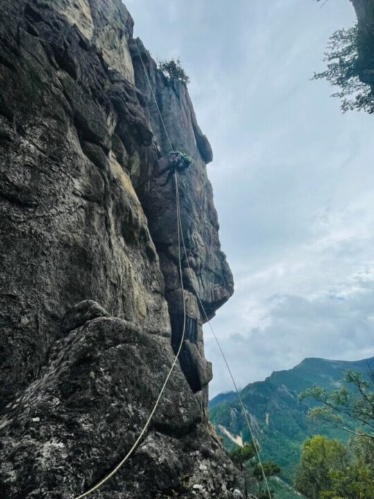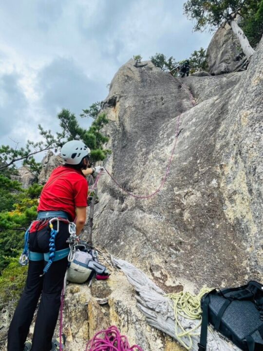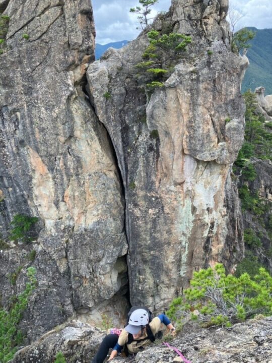 K子さんに先に行ってもらいルートを確認してもらう。トレースがあるということで、次に2峰を目指す。「ワイヤーの垂れたルンゼ」がどこかにあることを信じて進むと、ドンピシャに見つかった。ご夫婦協力し合いながら登ってくる様子が微笑ましい。少し上に上がって小休止。キャンプ場周辺の岩峰の展望に魅了される。2峰からは、たぶんダブルでロープを使うことがないだろうということで、懸垂や登攀はロープ1本。リードを私がして、セカンドがタイブロックでD地さんが上がって、ラストにK子さんというシステム。ラストが上がって来る間に、もう一本のロープでD地さんが懸垂の用意をしてすぐに下れる用意をすることで、時間を短縮した。3峰の中央部ルートはボルトがなく、ナチュラルプロテクション(以後ナチプロ・・・ハーケンやボルトを打たずにカムやナッツ、木を使ってアンカーを構築すること)で進む。「南稜レモン」というルートの最終ピッチから登山靴からクライミングシューズに履き替えて、登攀する。ザレた花崗岩で、御在所のような感じ。ここもカムを使ってアンカーを作って登った。「エビのしっぽの登りは正面から取付く」とトポに記載されていたが、ボルトもなく、ここもナチプロで這い上がる。5.6のルートで難しくはないが、高度感があり、緊張する。先行、後続パーティーもおらず、快適に登っていたが、ここに来てものすごいスピードで、後続パーティーが上がってきた。K子さんがフォローしているときに、クイックドローを落としてしまったが、そのパーティーが拾ってくれたため、何とか回収できた。「エビのしっぽ」からの懸垂は、高度感が半端なく、ロープが届くか心配であったが、何とかなった。下降路は、ちょうど「エビフライ」というクラックのルート(5.9)になっていたが、これをナチプロであがると思うとぞっとした。3.5峰の登りくらいから疲れが出始めた。15時くらいには、切り上げたいと思っていたので、5峰を登ったたら区切りをつけることにした。トポ通りに忠実に登れたこと、ナチプロでのクライミングもだいぶ慣れてきたので、十分満足できた。5峰に着いて、後は懸垂して降りるだけと、少し気が緩む。