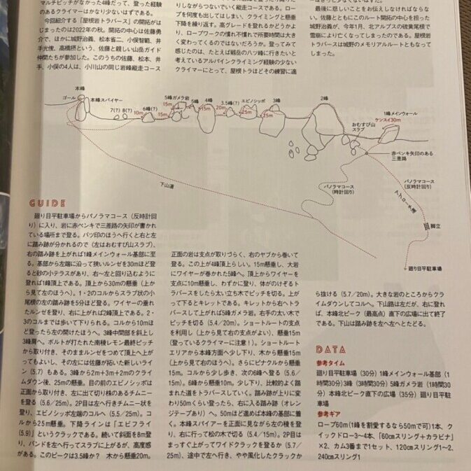 今回、このルートを計画したのは、この岡崎の猛暑からに抜け出し、且つ、それほど難易度が高くないマルチピッチクライミングができないかと思ったからである。7月の終わりのに、私が応援していたクライマー平出・中島氏がK2で滑落された追悼記事が掲載されていた山岳雑誌「ROCK&SNOW」105号を読んでいた中に、今回の「屋根トラ」が紹介されていた。それを読んで、御在所の前尾根の規模を大きくしたような感じがした。そして、このメンバーであれば、行けるのではないかと考えた。雑誌の記録は詳細であったが、いつもルーファイを誤り、適格なクライミングができないという課題が、私の中にあった。また、ナチプロを取りながらクライミングの経験が浅いという不安もあった。CLとしてこの2つを課題をクリアし、メンバー楽しんでくれれば最高の山行になるだろうと思った。