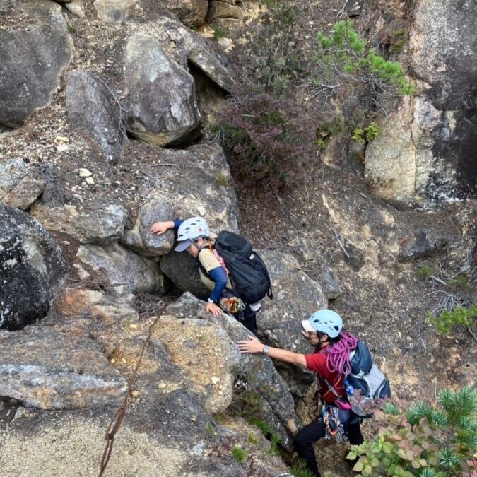 当日、睡眠時間は4時間程度であったが、早出で廻り目平を目指す。キャンプ場に近づくにつれ、今回目指す屋根岩の尾根がドカンと目の前に現れる。気持ちが高まる。連休初日であったが、車は意外に少なく、すんなりと駐車することができた。私自身、小川山は約20年振りで、学生の時に前所属していた山岳会の方によく連れて行ってもらったが、そのときと変わらず賑わっていた。準備をして7時過ぎには出発。まずは、屋根岩1峰を目指す。トポどおり進むも、フリークライミングの聖地である小川山は踏み後が多く、どのトレースが正しいか分からない。ルートファイニング(以後ルーファイ)が試される。狭いルンゼを歩いて進むと1峰の頂上らしき岩峰に出た。頂上は狭そうで、懸垂下降できるようなアンカーがない可能性もあったので、登頂は割愛し、木を支点にして、ロープをつないで30mの懸垂。ブッシュ混じりで、ロープが引っ掛からないことを願って引くと、何とか回収できた。ロープが重く、歩くよりも大変な作業であった。
