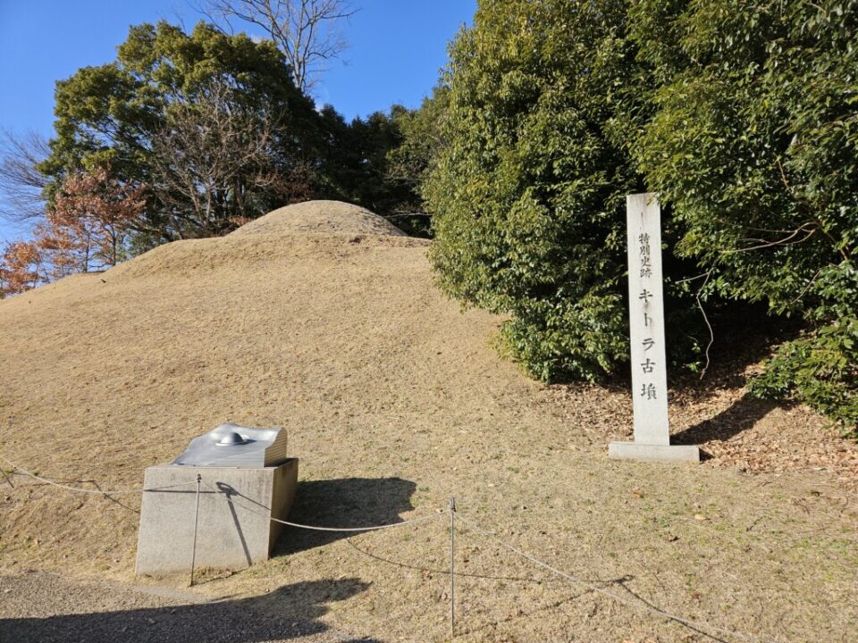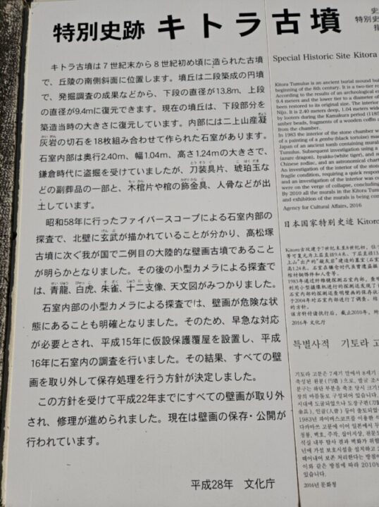 高取山城址は日本三大山城(岩村城、松山城)の一つでとても立派な物でした。戦国時代豊臣秀長が大修築を行い堅牢な城として完成しました。キトラ古墳は高松塚古墳の次に発見された大陸風壁画古墳で7世紀末から8世紀初めの古墳で誰の墓か解っておらず、骨や歯から大柄な熟年男性で豪華な副葬品や正倉院に伝わる宝物の様な太刀も有りかなり身分の高い人物の墓で有った様です。