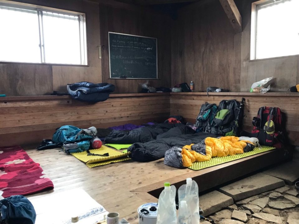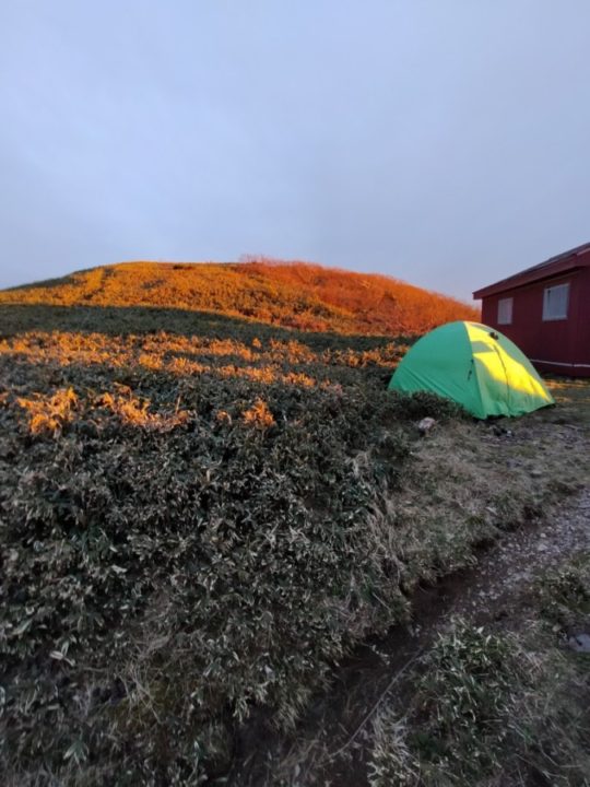小屋は満員で入りきれない人は外でテント張ってましたが、若者4人が「テントを持ってない」と困っていたのでI間さんが背負ってきた山岳会のテントを張ってあげてました。装備を軽視すると命に関わると実感しました。「彼らにとってI間さんは命の恩人だよ」とS木菜さんが言ってました。