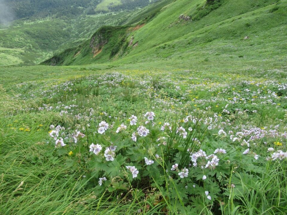 ダイレクトルートと合流し、進むとトカチフウロの大群落があり、これほどの群落は見たことが無い!ガスってはいたが、念願の富良野岳に登頂し、帰りはダイレクトルートを下る。
