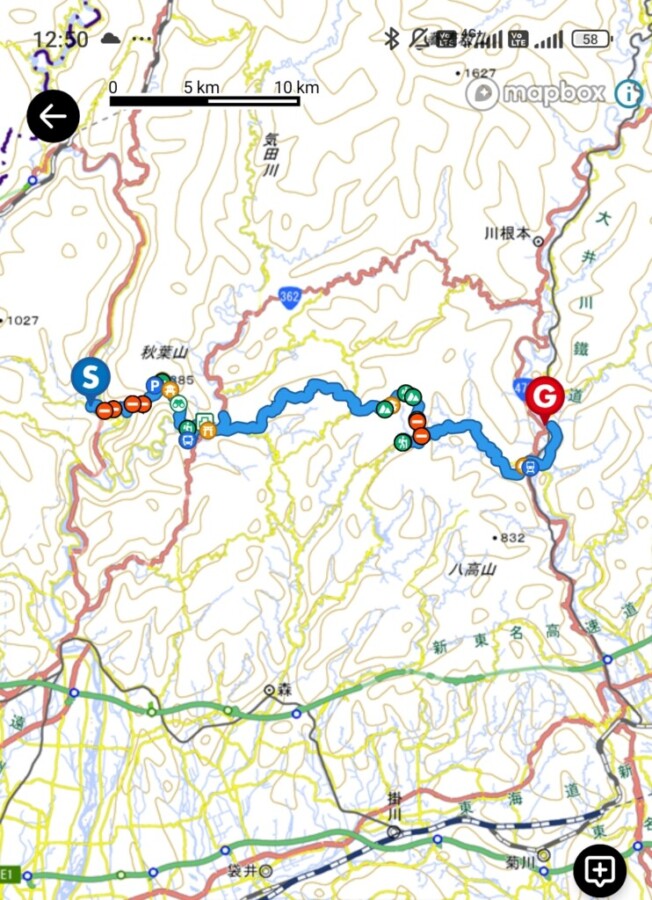 やまめの里(5:30)–平松峠–八垂の滝–天王山公園(9:11)–大井川鉄道家山駅(9:21)–道の駅川根温泉(10:30,11:30)–大井川鉄道川根温泉笹間渡駅(11:54)+++金谷駅+++浜松駅+++岡崎駅(14:30)