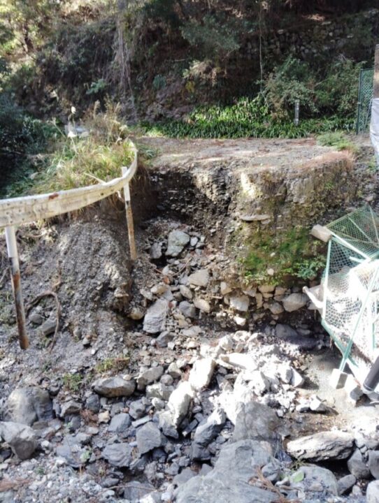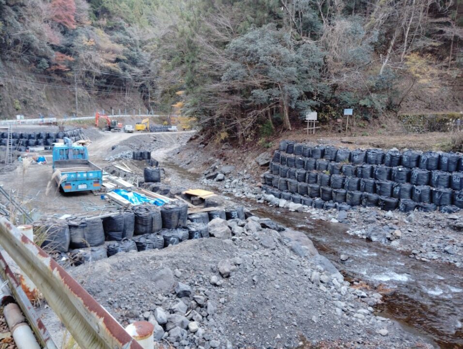 八垂の滝手前の橋が流されて新しい橋の工事中。平松峠から県道を迂回する。