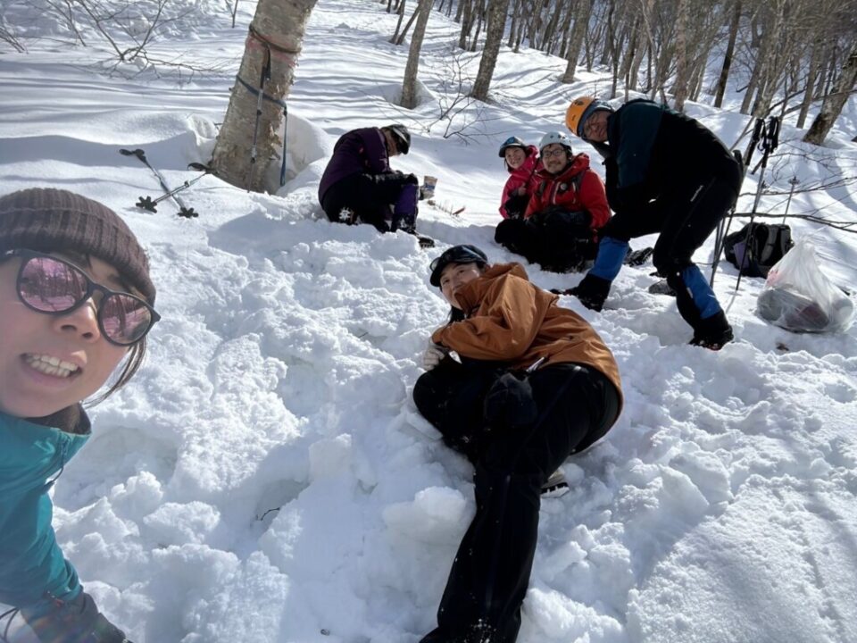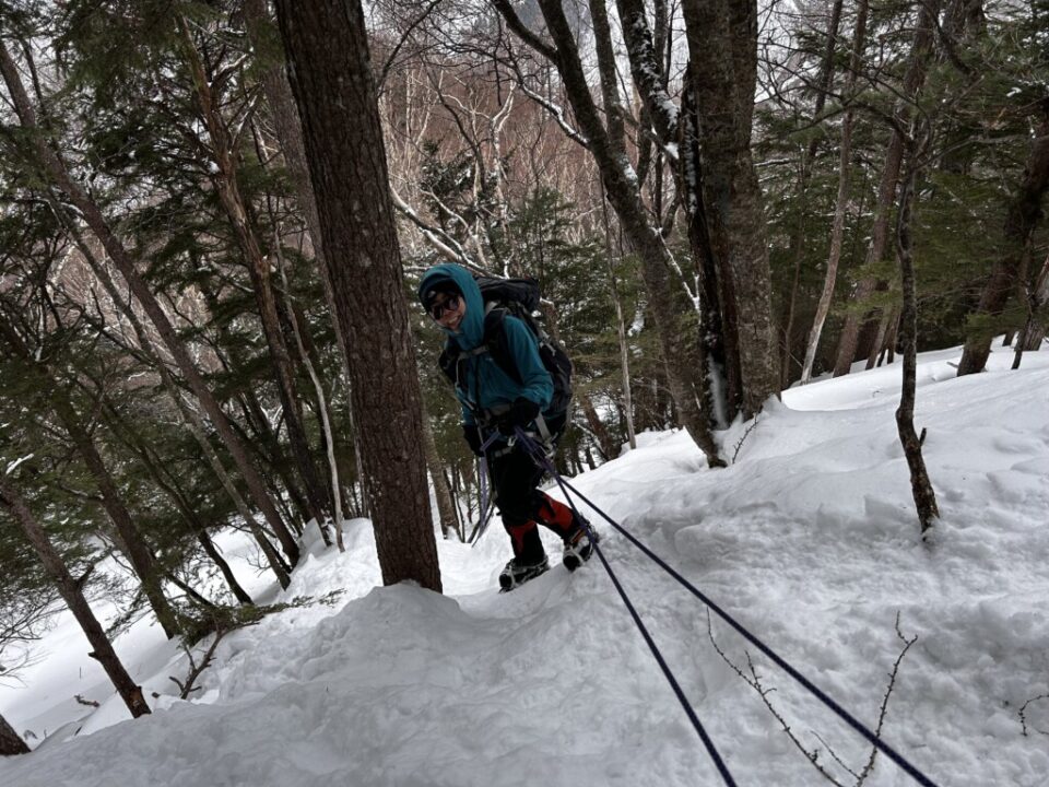 3日間過ごすテントは霞沢岳西尾根取付き付近に張った。登山道からは見えないし風は全く吹かない絶好の場所だ。近くには滑落停止をするには良い斜面もあるので、そこで各々雪訓らしい事をした。