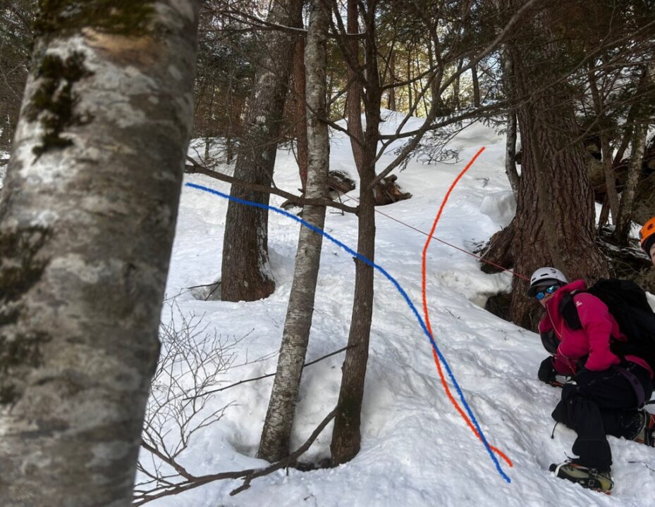 ロープを巻いた木は夏に靴を拾った場所である。周りの景色を思うと救助現場はもう少し上の様だ。
