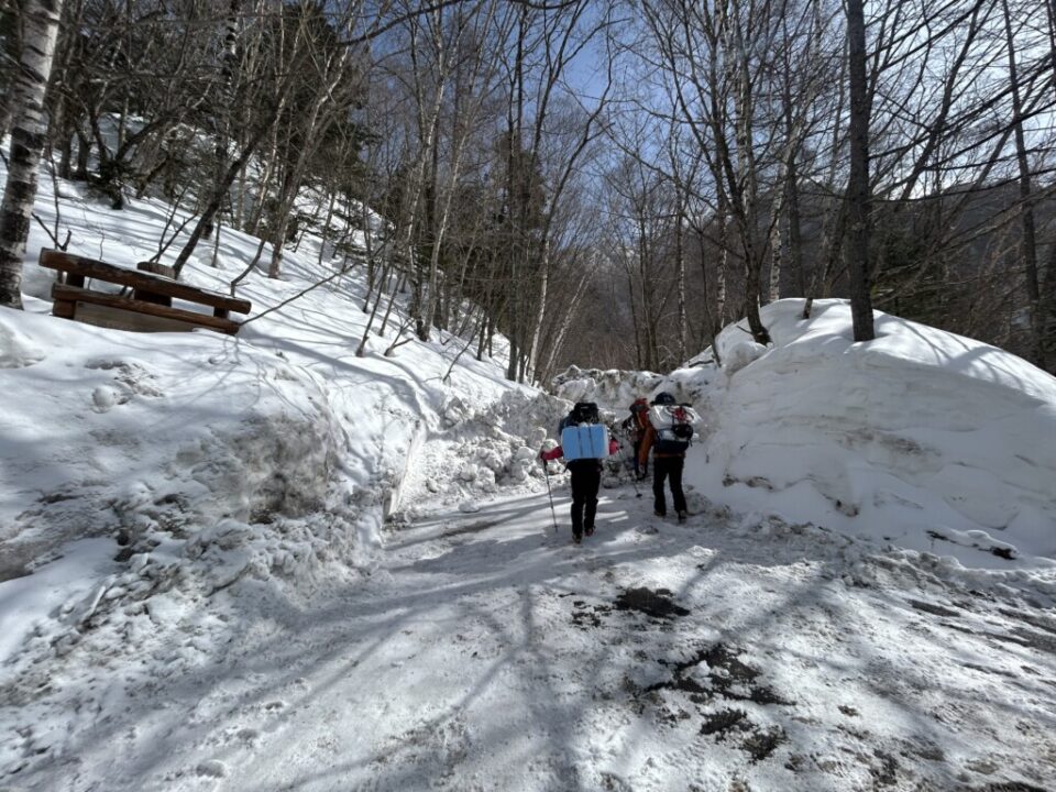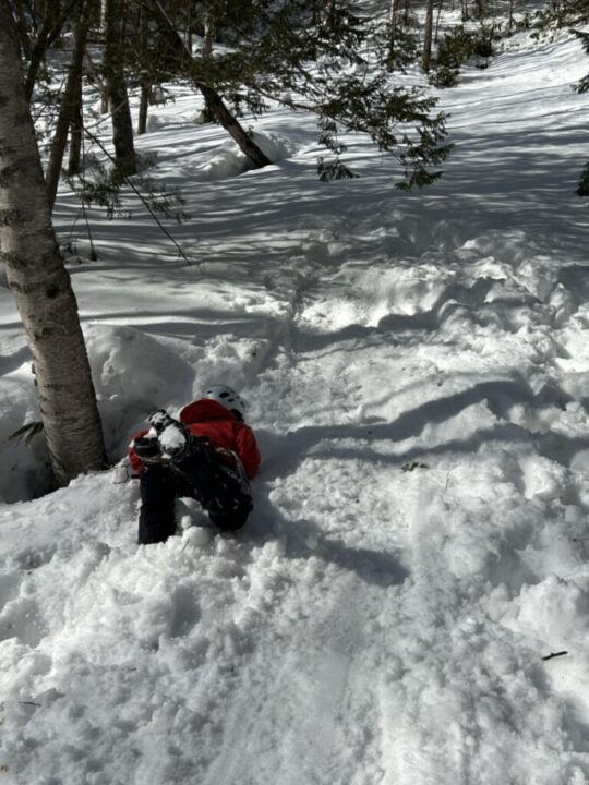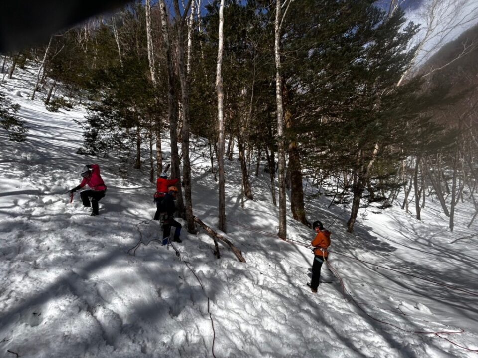 雪訓初日はふみさんの命日、晴天の下でお参り。翌日滑落現場を見ましたが滑落するような危険な場所とはあまり感じなかったのですが、滑落したら滑落停止でも止まらなさそうな急斜面でした。当時についてお話を聞き、大切な仲間を救うためにそれぞれが最善の行動をとるために行動されていたのが凄いなと感じました。そして言葉にしてお話できるまで気持ちの整理をしながら当時のことを乗り越えて前を向いている姿は逞しく見えました。登山はリスクがつきもの、登りたいではなく登れるための技術を身につけるとともに最後まで気を抜かずに下山することの大切さ、いざという時のためにファーストエイドなどの救助技術を身に付けることの必要性を感じました。自分自身も同行者も危険に巻き込まれないように気を引き締めて登山をしていきたいと思います。