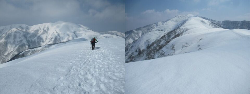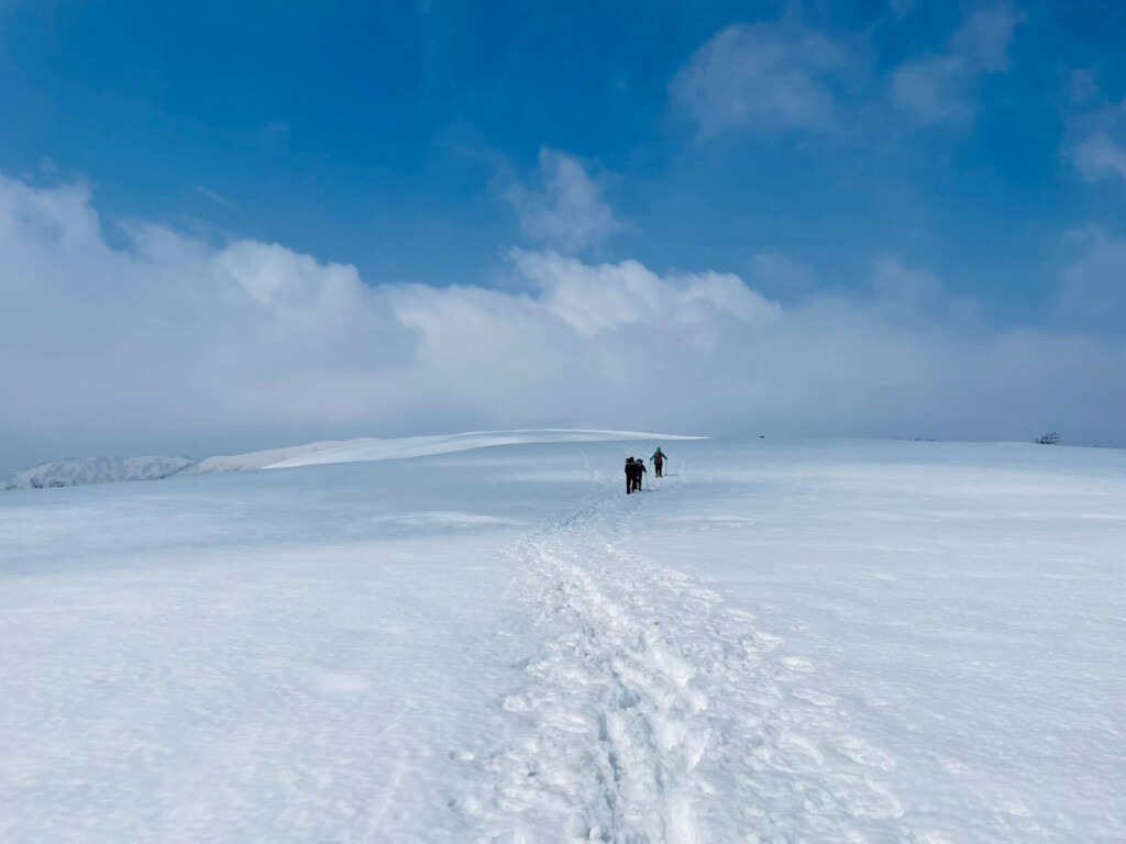ここからが本番。銀杏峰の広大な雪原を過ぎると部子山へ続く真っ白な稜線が広がる。これが本当に見たかった景色!テンションが急激に上がる。