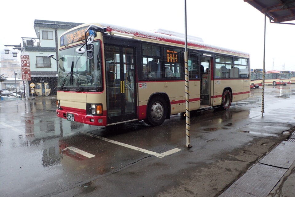 雨は7:00頃に雪へと変わり、湯田中駅から横手山スキー場まで、長電バス。