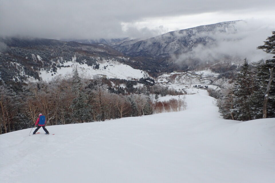 陽坂から横手山リフト2本を乗り継ぎ、ゲレンデを滑って渋峠へ。