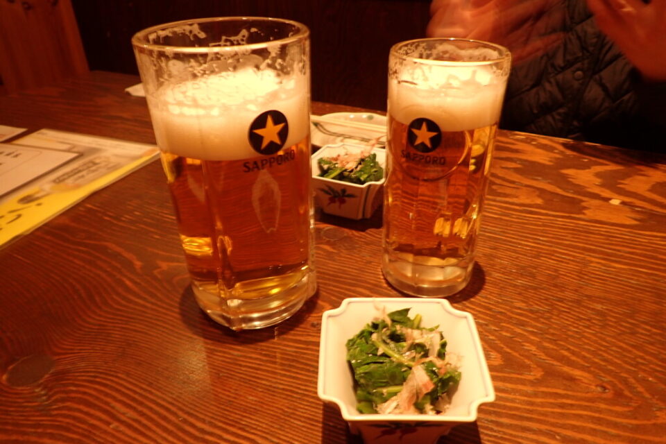 待ちきれずに飲んでしまった、乾杯後の生大と生中。