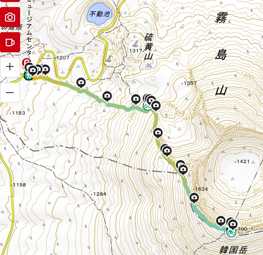 4月27日民宿霧島登山口温泉《泊》===えびのエコミュージアムセンター(08:29) — 韓国岳登山口(08:33) — 硫黄山火口展望所(09:01) — 韓国岳(霧島山)(09:56、10:25) — 硫黄山火口展望所(10:56) — 韓国岳登山口(11:22) — えびのエコミュージアムセンター (11:24)===湯の里ユースホテル《泊》