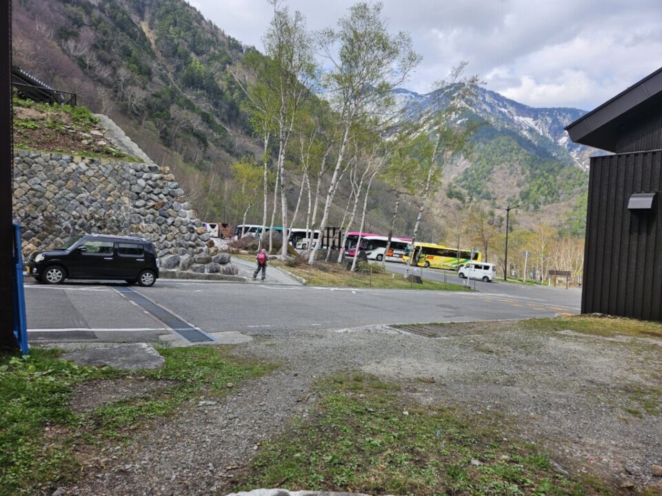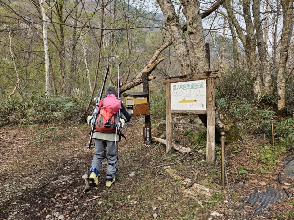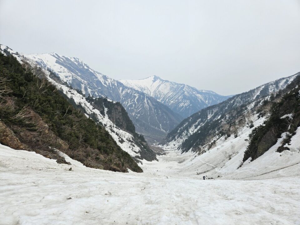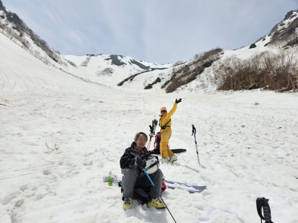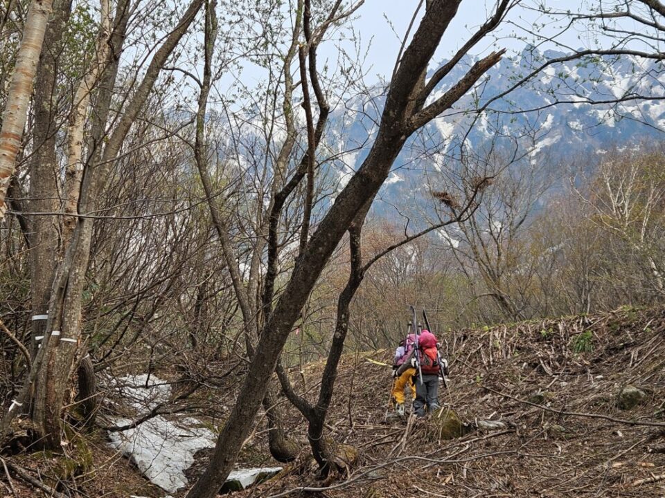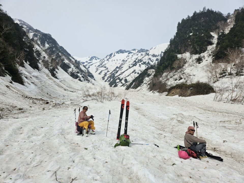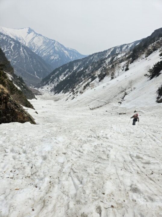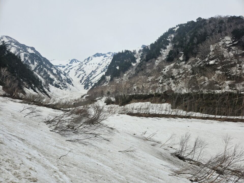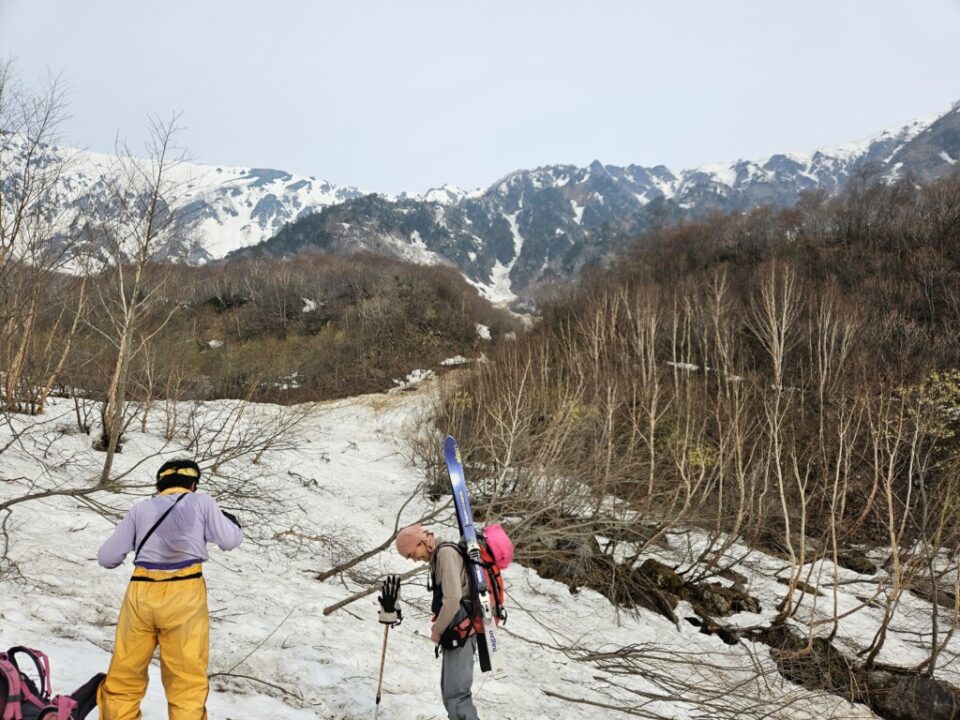 柳川瀬公園を18:30に出発してその日は扇沢無料駐車場まで30分程手前の道の駅安曇野松川のトイレ棟の先の裏道沿いに手頃なスペース見つけにてテント泊、翌朝テン場から有明山、常念岳など雪を纏った後立山連峰が望めました。テントを撤収し、6時にはには針木岳登山口に到着し、そこから1時間程雪の無い薮の多い林道歩き、7時前にはスキー板を装着(1530m)8時頃に大沢小屋右手に見て更に登って行くと1750m辺りで大規模デブにに遭遇、雪渓をほぼ埋め尽くしていました。