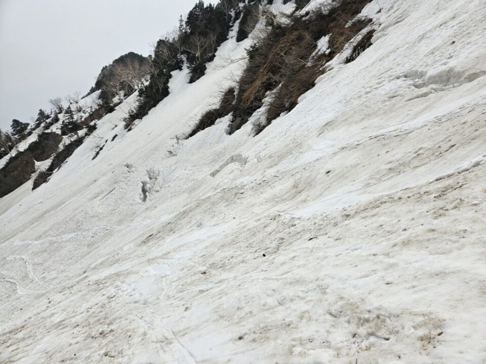 1840m辺りで雪渓越に三角形の爺ケ岳が望め最高の景色でした、その後高度を上げ2000m辺りに差し掛かると今度は沢山のクラックです。滑って下ってくると突然目の前にクラックて感じです。怖いですね。今回はその先の2110mまで登り打ち切り、その先の針ノ木峠まで600m位の位置です。なんとここまで来て元祖ダムカレーの最終オーダーの時間が有るのする事する事にしました、結果これで良かったと下ってて思い知らされました。雪渓いっぱいに広がったデブリを避ける為斜面を斜滑降で滑る時間が長くとても疲れました。もう、行かないと思いました。