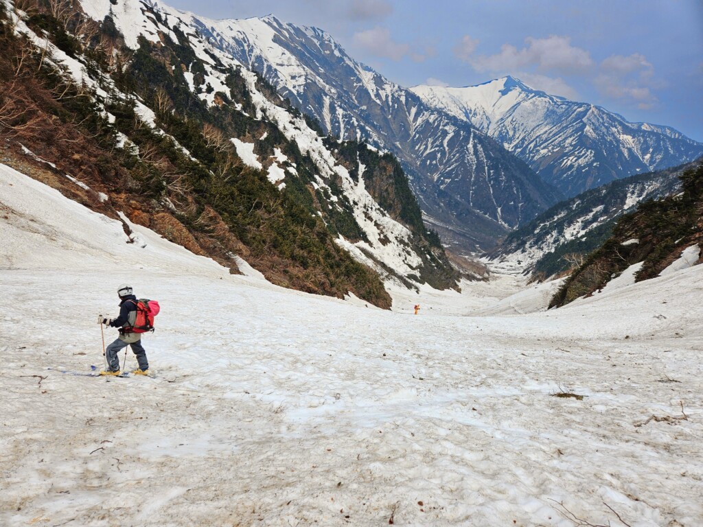 柳川瀬公園を18:30に出発してその日は扇沢無料駐車場まで30分程手前の道の駅安曇野松川のトイレ棟の先の裏道沿いに手頃なスペース見つけにてテント泊、翌朝テン場から有明山、常念岳など雪を纏った後立山連峰が望めました。テントを撤収し、6時にはには針木岳登山口に到着し、そこから1時間程雪の無い薮の多い林道歩き、7時前にはスキー板を装着(1530m)8時頃に大沢小屋右手に見て更に登って行くと1750m辺りで大規模デブにに遭遇、雪渓をほぼ埋め尽くしていました。
