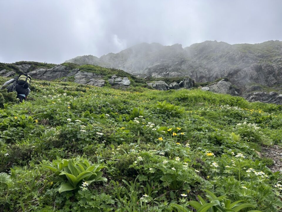 その後ロープはしまったが、一般登山道までクライミングシューズで登った。お花畑が凄くて癒された。