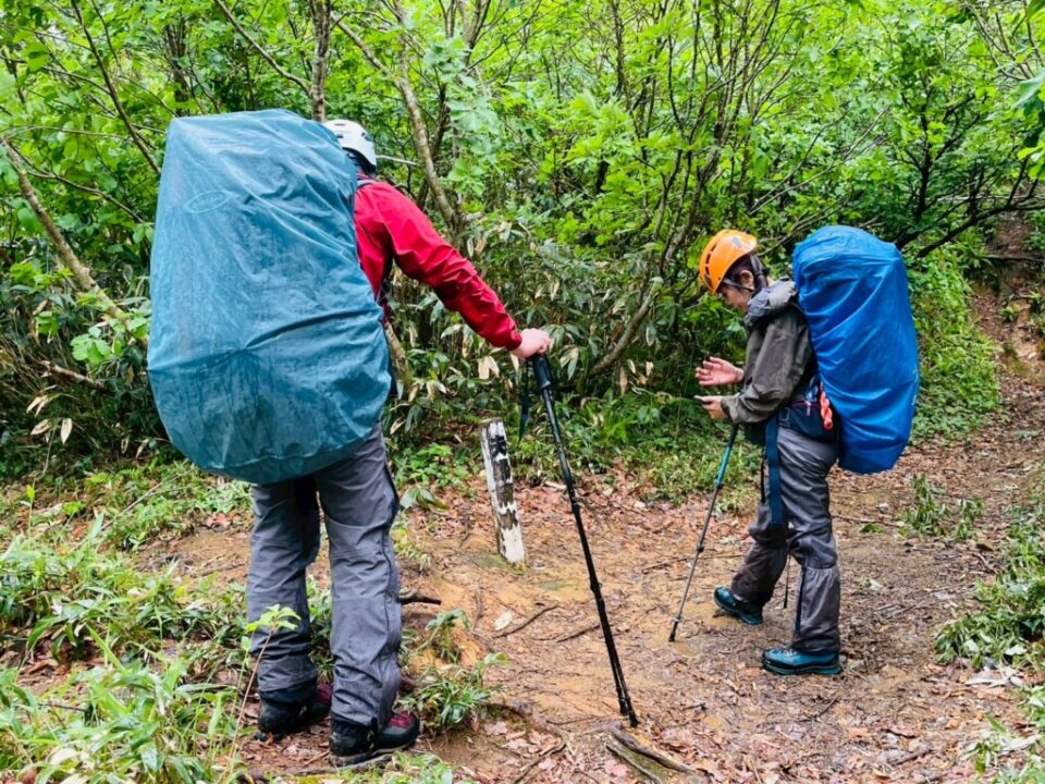 そこそこの雨で、レインウェアを着て歩くものの、結局は汗でズブ濡れ。樹林帯ですら風が強く、先が思いやられる。この頃は、わりと真剣に撤退を視野に入れていましたね。