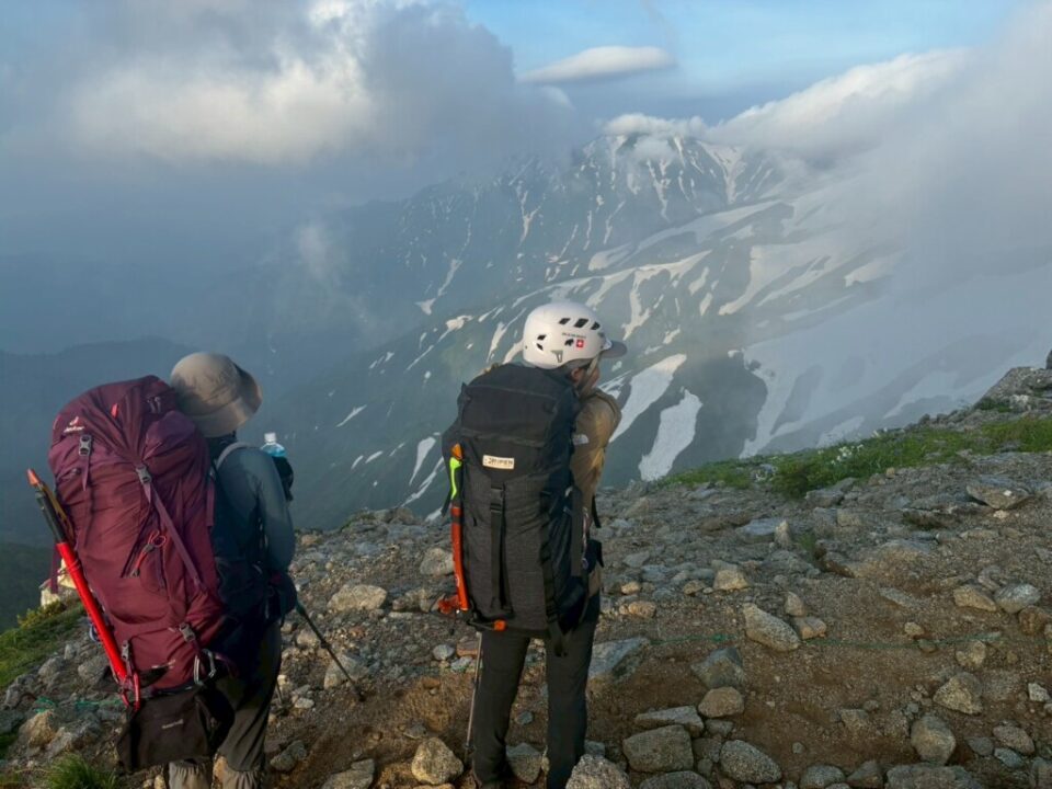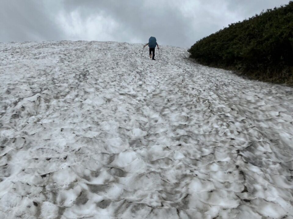 途中ですれ違ったパーティは「10回くらいアイゼンを脱着した」「ルーファイがめちゃくちゃ難しい」と言っていましたが、さすがにそれは大袈裟かな。でも、もしかしたら、南下と北上で印象が違うのかも。とはいえ、先が見えない中での雪渓歩きで、5回くらいはアイゼンの脱着があり、ペースの上がらない1日でした。ヤマレコのCT比で、休憩込みで倍近い所要時間となりました。