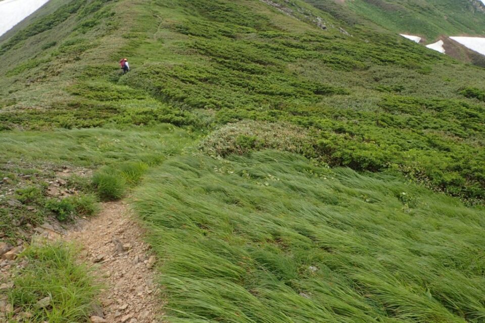 日本海側から風が吹きつけていたので、登山道が稜線に対して山形県側に入ると風裏になって一息ついて、尾根芯から新潟県側は暴風、を繰り返したような気がします。