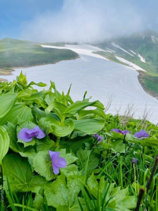 花が咲いているからそれなりに楽しめるんですが、雪渓は面倒でした。先が見えないから、どこへ向かえばいいのか分からないし、見えないから様子も分からないので、とりあえずアイゼンつけるか、ってことで時間を食いました。