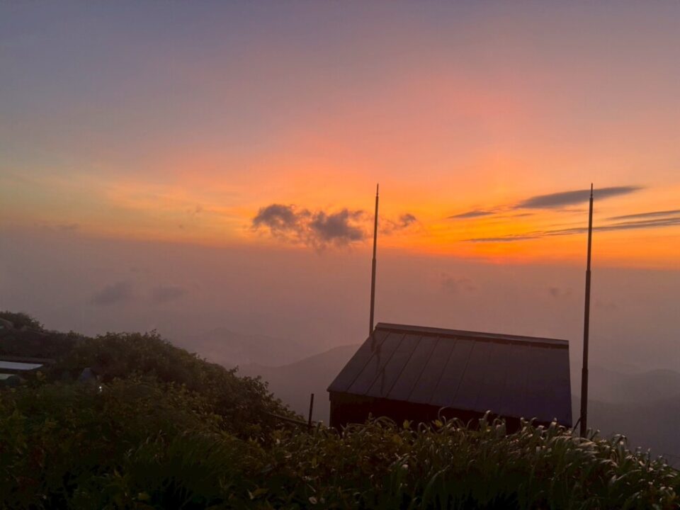 朝焼け。私は小屋から出ることもなく、朝飯に夢中になっていました。