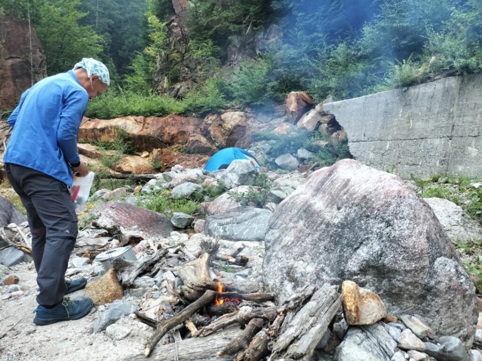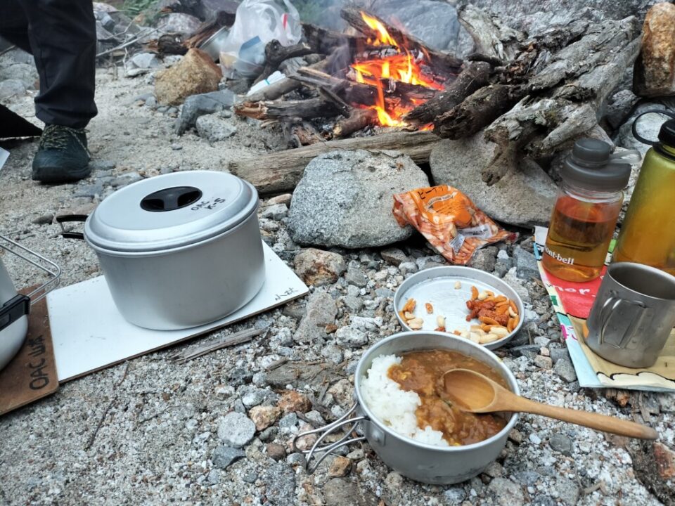 クタクタになったが、暗くなる前にテン場に着いた。装備を片付け終った頃、日が落ちて暗くなった。焚き木がぜんぜん濡れてなかったので焚き火に点火。固形燃料を使ったのですぐに火がついた。沢で冷したビールで乾杯。麻婆春雨の夕食をいただく。食べ終えて寛いでいたら雨がパラパラし出したので、急いで片付けてテントに入る。疲れたのでさっさとシュラフに入ったら大雨になった。雨音がうるさくて眠れなかったが、30分ほどで落ち着いたようだ。