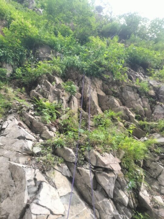 最初、その岩を両手で引っぱって確認したのだが、いざ懸垂しようと捨て縄を掛けてザイルを準備して、念の為、体重をかけてみたらグラっと動く。これではダメだ。すぐ上に木が2本あったので、そちらに変更。再度確保してもらって少し登り、根っこの近くに捨て縄を回して引っ張ってみる。こちらの方がマシなようだ。隣の太さ6cmほどの木に自分のスリングを(涙を飲んで)残置として追加し、再度懸垂下降を支度する。体重をかけてみて、これなら大丈夫だろうと判断し、懸垂で降りた。