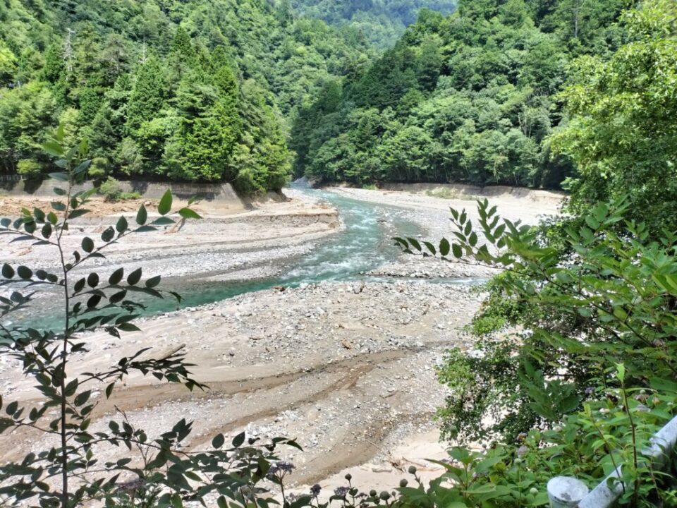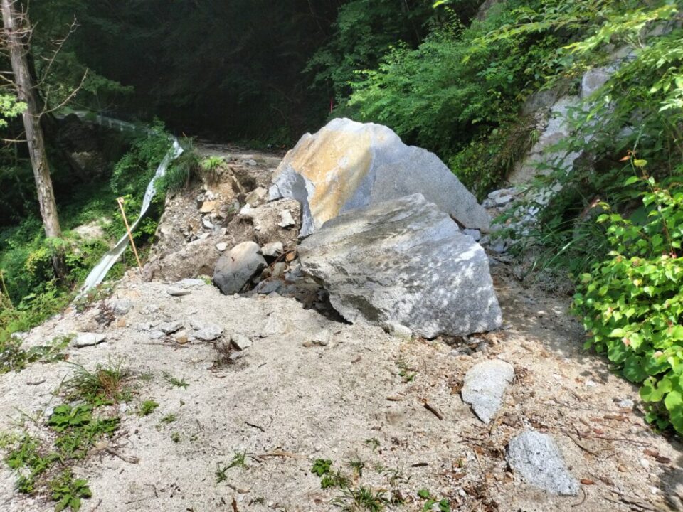 ゆっくり片付けを済ませ、9時半にテン場を出発した。綺麗な今朝沢を見ながら下っていく。工事の人が路肩で作業していた。お盆の土曜日なのに…。伊奈川ダムのすぐ上の分岐で休憩し、空荷で崩落現場を見に行った。分岐から5分程度の近さだった。道路に軽トラサイズの石が落ちており、これが上の支流から落ちてきたのかと思うと恐ろしい。人間はなんとか脇を通り抜けられそう。