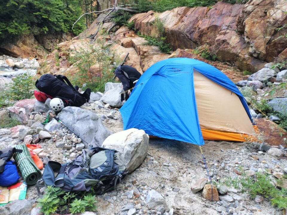 F1でも再度ザイルを出して通過。その後は普通に歩いて進む。途中、沢の横の埋もれた支流も使って少しだけショートカットしながら下っていく。少しだけ雨に降られたが、すぐ止んだ。行動時間が長くなってきたせいか、さすがに疲れを感じ始める。空が暗くなりはじめ、テントはまだかと思っていたら、急に青いテントが視界に入る。もっと先だと思っていたので、自分らのテントだと分って大喜び。