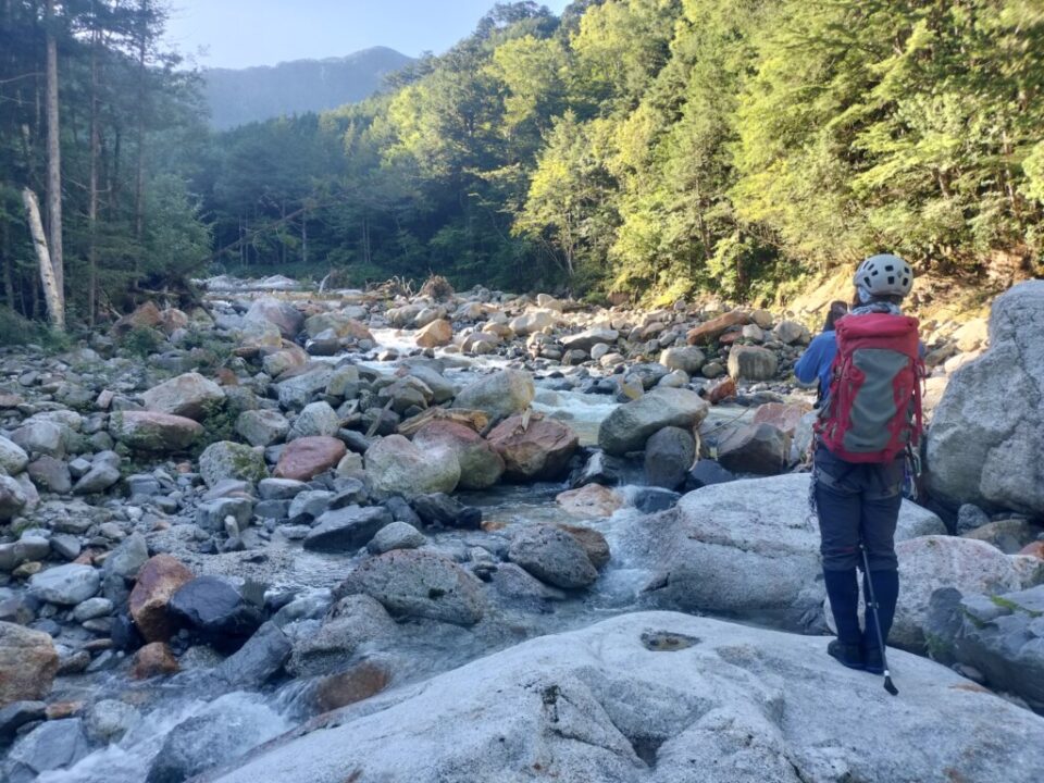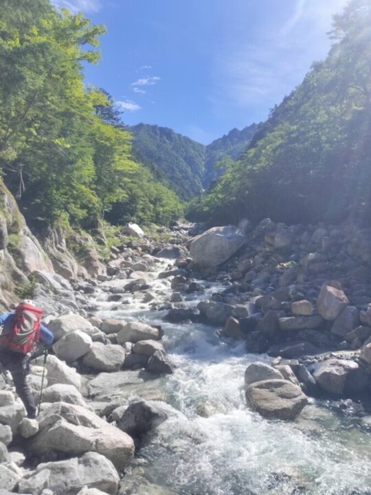 水は冷たいが、渡渉する程度なら問題ない。河原が広く、今日は快晴なので気持よく進める。何度も渡渉しながらゴーロ帯を先へ進む。水流は多いが、浅い箇所もたくさんあるので、渡渉に困ることは少なかった。