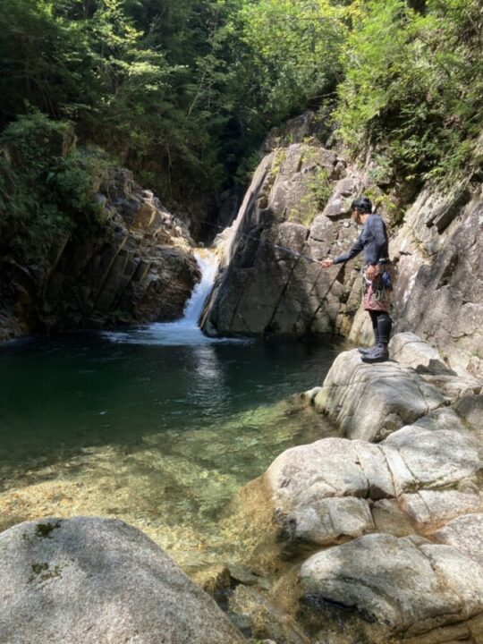 その後は、滝を泳いだり、ウォータースライダーをしたり、飛び込んだりしながら、童心に還る。下る途中で、足が滑って沢バイルに右腹を強打する。ちょっと痛みはあったが、そのまま下降を続け、14時前には車に到着する。
