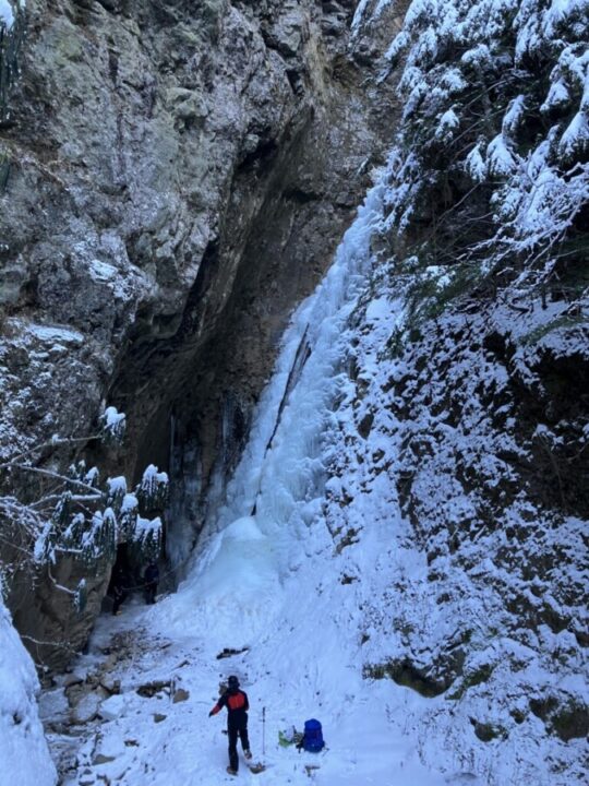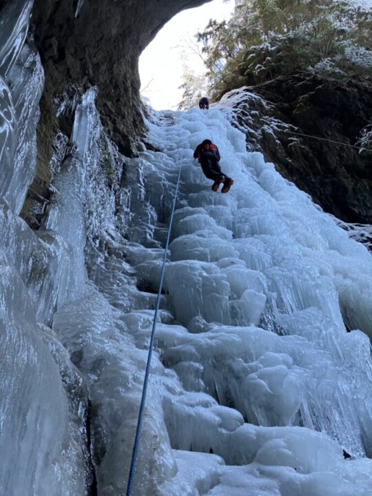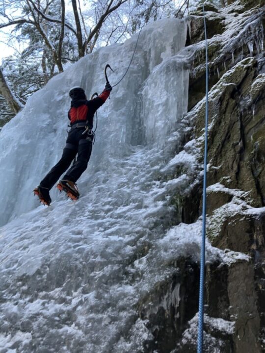 251229_夏沢鉱泉醤油樽ノ滝アイスクライミング 投稿者: yonechan2025/12/292026/02/27山行報告、活動報告 今シーズン、はじめてのアイスクライミング。元豊橋山岳会のIさんと八ヶ岳夏沢鉱泉へ。昨年は、上部のG2に出かけたが、今回は下部の醤油樽ノ滝を行くことにした。氷結状態は、前評判通り悪くて、滝の真ん中は、水がシャアシャアと流れていた。先行パーティが登っていたので何となった。氷の塊が重なったような階段状態で登りは易しかったです。帰りにアプローチ途中にある垂直ボルダーアイスで遊んできた。