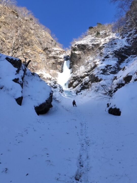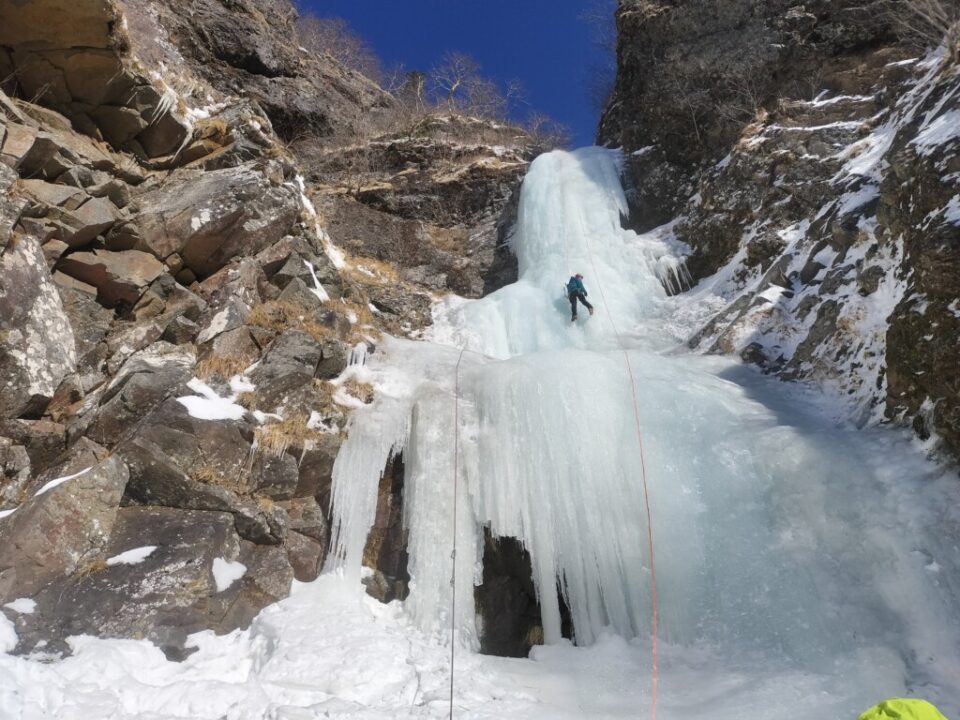 テン場からすぐの沢を30分ほど詰めていくと、目の前に大きな滝が現われた。先行パーティが既に登っている。トップロープになっているので、我々よりずっと前に来て、一度登りきっているのだろう。