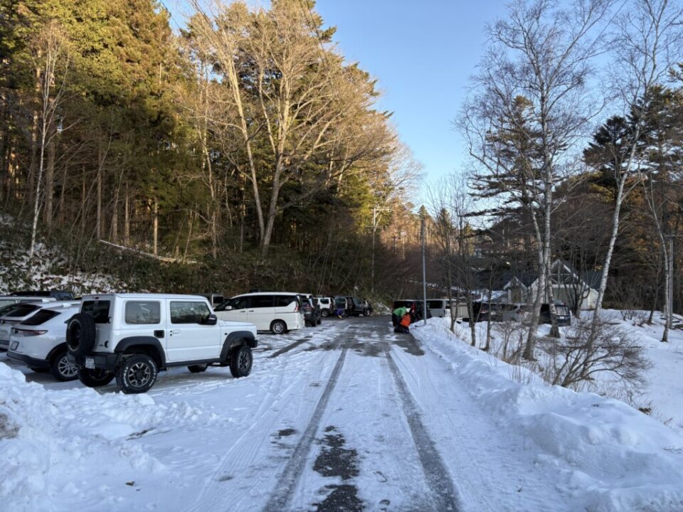 登山口横の駐車場は朝7時半頃には満車でした。準備中にも他の車がやってきて人気の高さを感じました。例年に比べ雪は少なくチェンスパのみで十分な雪の量との事前情報でしたが、アイゼン歩行の練習のため登山口からアイゼンを装着しました。事前情報に漏れずほとんどの方はチェンスパ、ツボ足の方も何名かいました。