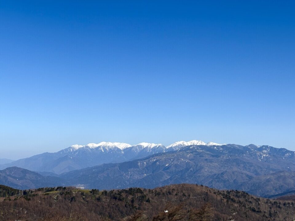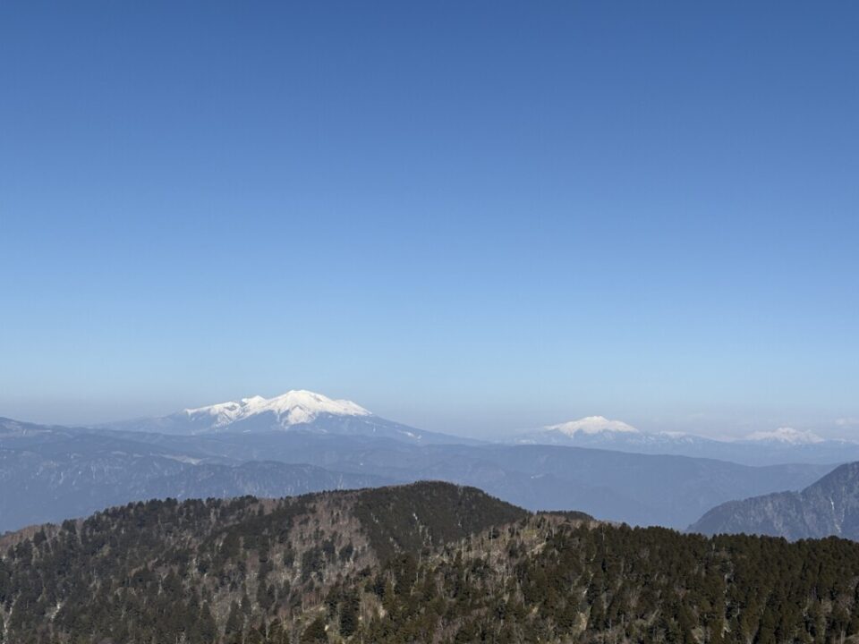 全体的に雪は踏み固められて歩きやすい状態でした。前日からの黄砂で景色が楽しめるか少し心配していたのですが、黄砂の影響はそれほどなく木々の隙間から見える空は綺麗な阿智ブルー。当日は晴天に加え季節外れの暖かい予報で、予報通り気温が高く南沢山までの樹林帯はかなり暑かったです。南沢山に到着すると御嶽山が見え始め、南沢山~横川山の稜線歩きでは中央アルプスや南アルプスまで見ることができました。横川山は360°絶景で、多くの人でにぎわっていました。手元の温度計で-1℃と暖かく、ゆっくり絶景とランチを楽しみました。