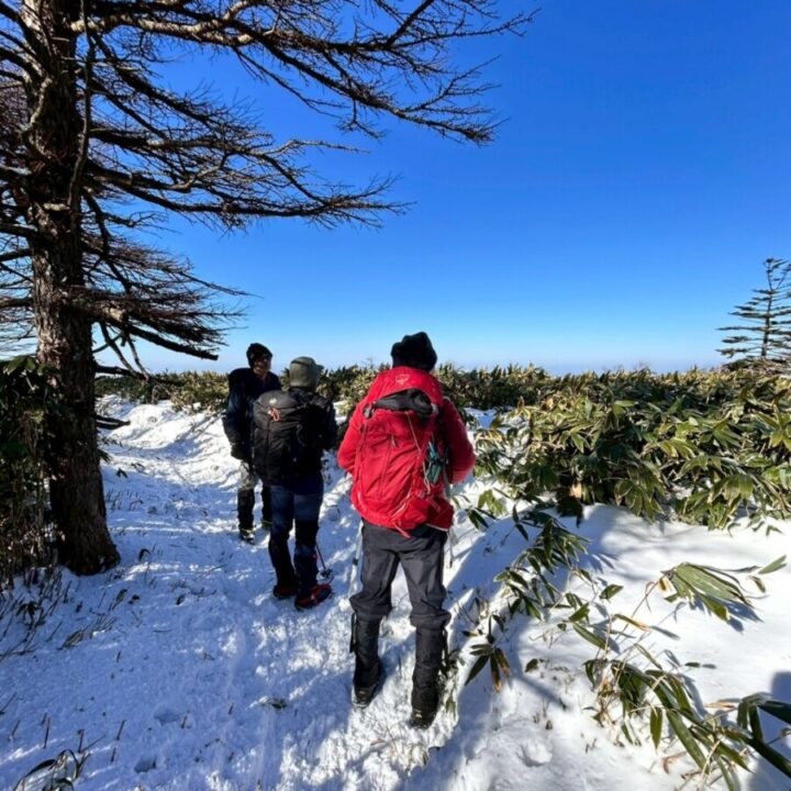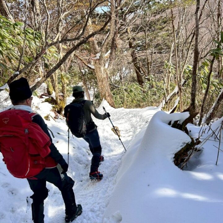 帰りも終始晴れていて、景色を楽しみながら下山しました。帰りも雪は歩きやすい状態でしたが、最後登山口に近づくと溶けて土や木の根が露出している箇所もあり、アイゼンで歩くのに少し気を使いました。