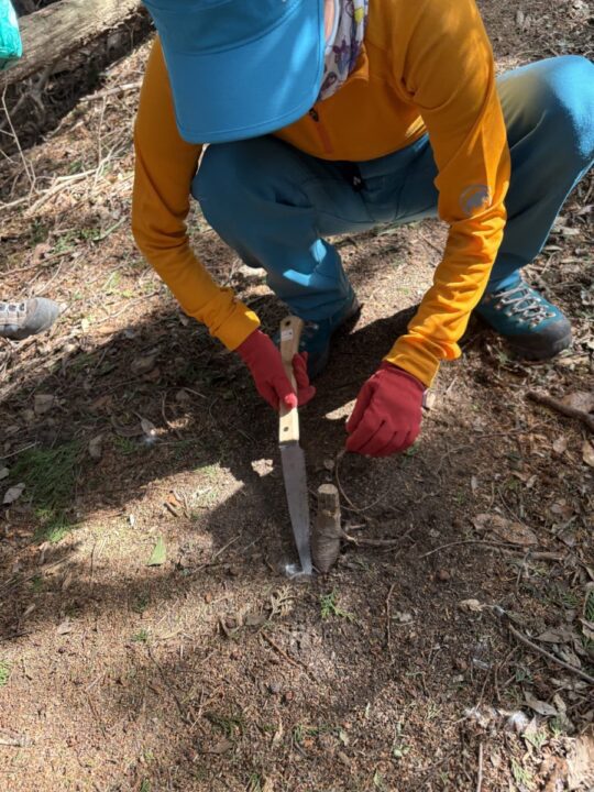 登山道で足を引っかけた木の幹 飛び出ているので危険。切る事に。