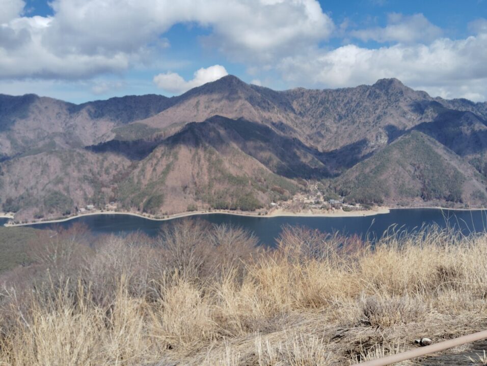 県境バス停から13:40に割石峠へ下り本栖湖方面へ竜ヶ岳の縁を歩き出した。葉の落ちた樹木の間から富士山がのぞく。バスの窓からは山頂に雲がかかっていたが、少しずつ雲が切れてきたようだ。およそ1時間で竜ヶ岳登山口入口に着いた。ここから本栖湖へ下って城山の山麓を進み国道139号線の下のトンネルを通過した。国道の横に歩きやすい東海自然歩道が付いていて、そろそろ現在地を確認しようと思っていたら精進湖民宿村に出た。 精進湖民宿村は当主が高齢で廃業した民宿が多いそうだ。樹海荘も2月までは予約をとっていなかったと言う。