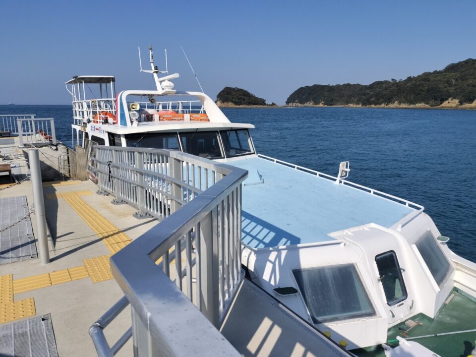 乗船時間が来て小さい船がやってきた。私の他に二人、釣り人が来て乗船した。内海なので波は穏か。たくさんの釣り船を見つつ、20分ほどの乗船で友ヶ島の野奈浦に着く。我々が降りると、帰りの観光客が大勢乗り込んでいった。もう時間的に島内に人は少ない。