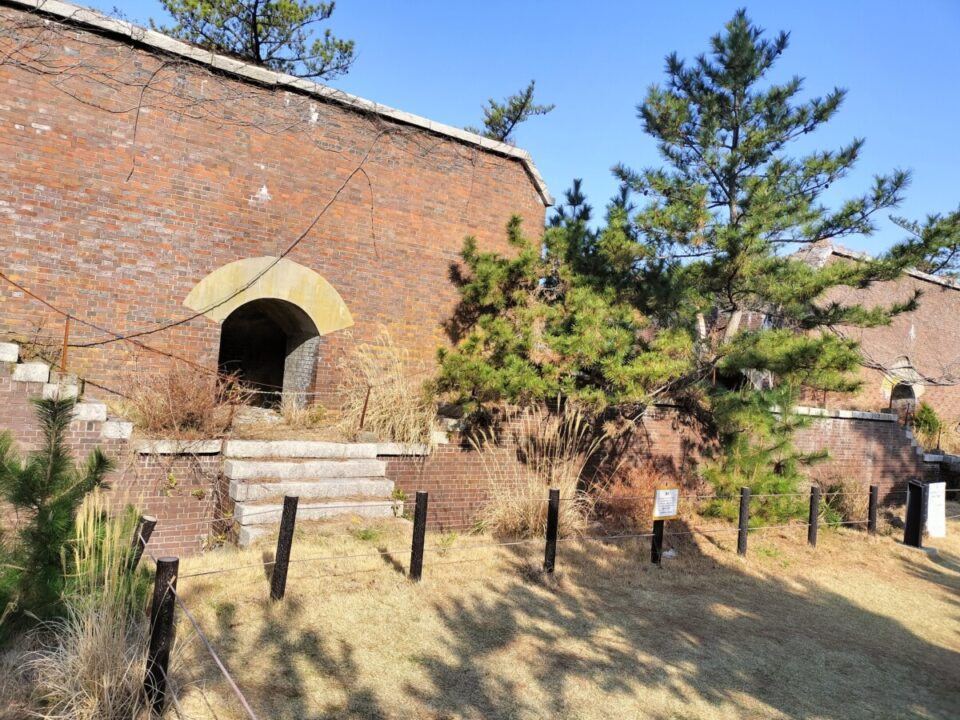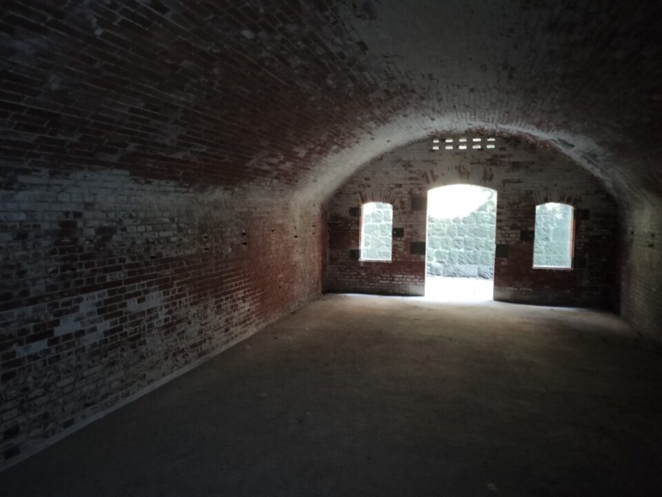 テントを撤収し、6時半に歩き出した。7時に桟橋の近くに重いザックをデポし、20Lのザックで見学に出発。20分ほどで第三砲台跡地に到着。誰もいない施設を歩いて回った。こちらにも将校用の建物があって、床の間の雑作がまだ残っている事に驚いた。弾薬庫がいくつも並んでいて、ライトを着けて中を抜ける。